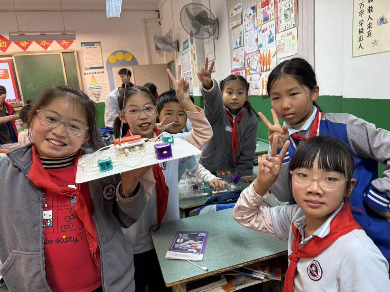 活动以 “电” 为核心,精心设计了 “电的简单认识”“电子积木介绍”“科学罐头小实验”“分组创意搭建” 四大板块。课堂伊始,范志祥老师从生活中常见的电现象切入,用 “小女孩滑滑梯头发炸起” 等生动实例,将抽象的电学概念具象化,让同学们快速建立对电的基础认知。在电子积木介绍环节,趣味十足的装置展示与详细的零件功能讲解,瞬间点燃了同学们的探索热情,大家纷纷举手提问,现场互动氛围热烈。