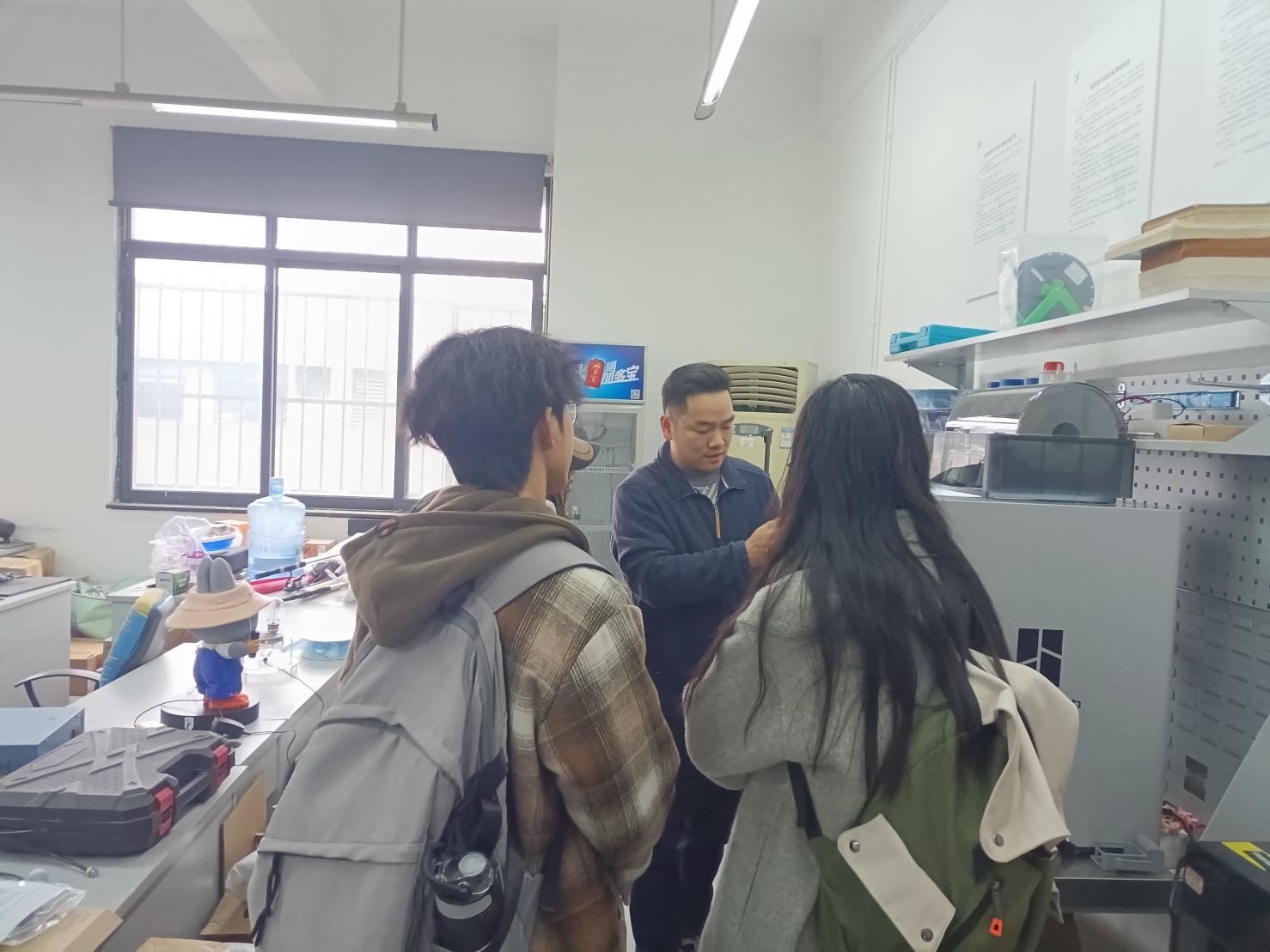 交流互动环节,3D 打印设备旁成了最热闹的区域。同学们纷纷驻足观摩,目光紧紧跟随打印喷头的移动轨迹,不时提出疑问,范老师耐心解答每一个问题,还鼓励不同专业同学交叉交流,现场形成了跨学科思维碰撞的热烈氛围。