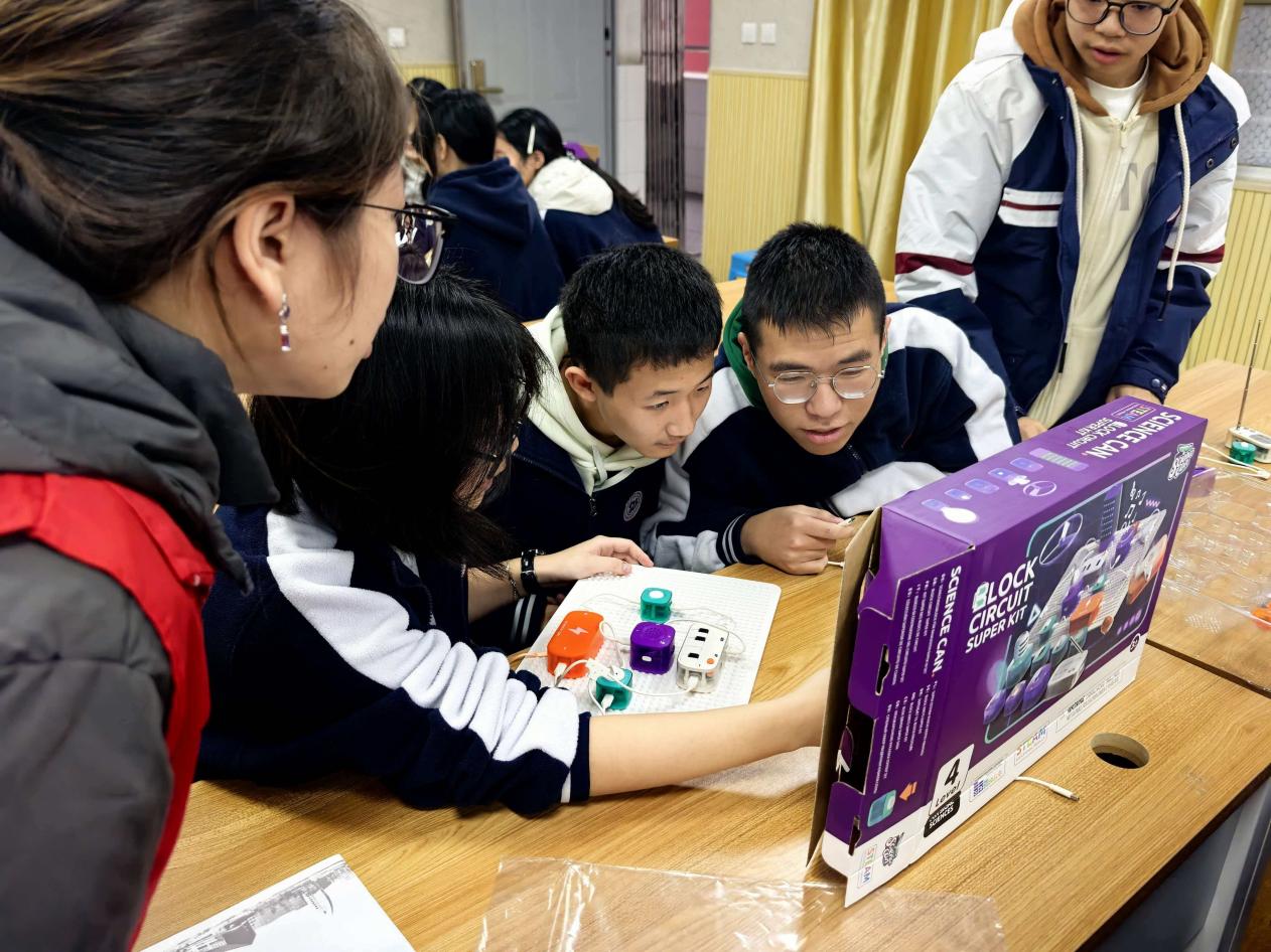 讲座现场,范志祥老师凭借幽默风趣的讲解技巧,将电路连接、能量转换等物理基础知识与生活中的常见现象相结合,让原本抽象的原理变得通俗易懂。在随后的电子积木小实验环节,高一同学们以小组为单位协作动手,在志愿者的答疑帮助下,成功搭建出七彩灯、变音器、收音机等装置,亲身感受物理科学在实践中的奇妙应用,现场互动氛围十分热烈。