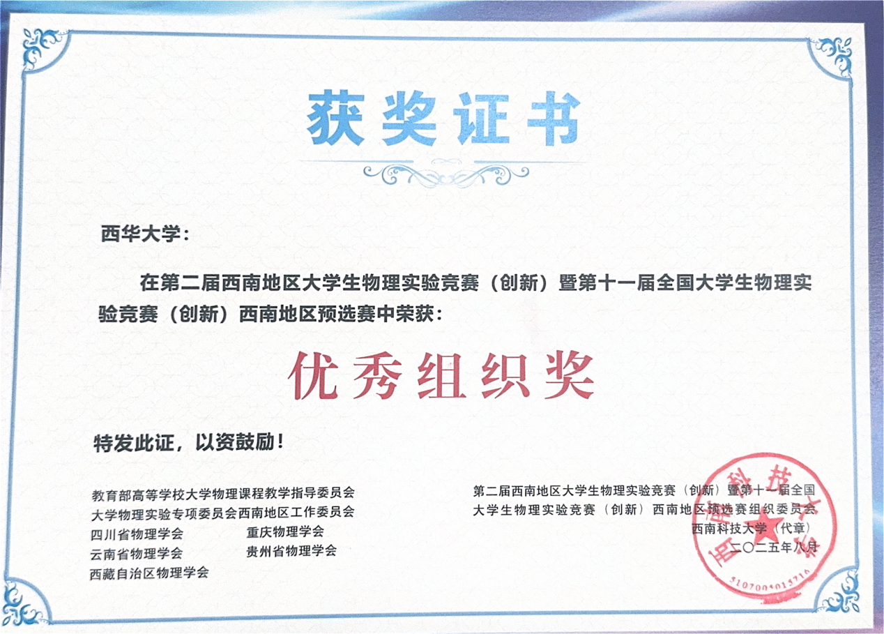 第二届西南地区大学生物理实验竞赛(创新)暨第十一届全国大学生物理实验竞赛(创新)西南地区预选赛于 2025 年 8 月 5 日至 8 日在西南科技大学顺利举行,我校学子凭借扎实的物理实验功底、创新的设计思路与出色的现场表现,在竞赛中斩获多项荣誉,充分展现了西华大学在物理实验教学与创新人才培养方面的显著成效。