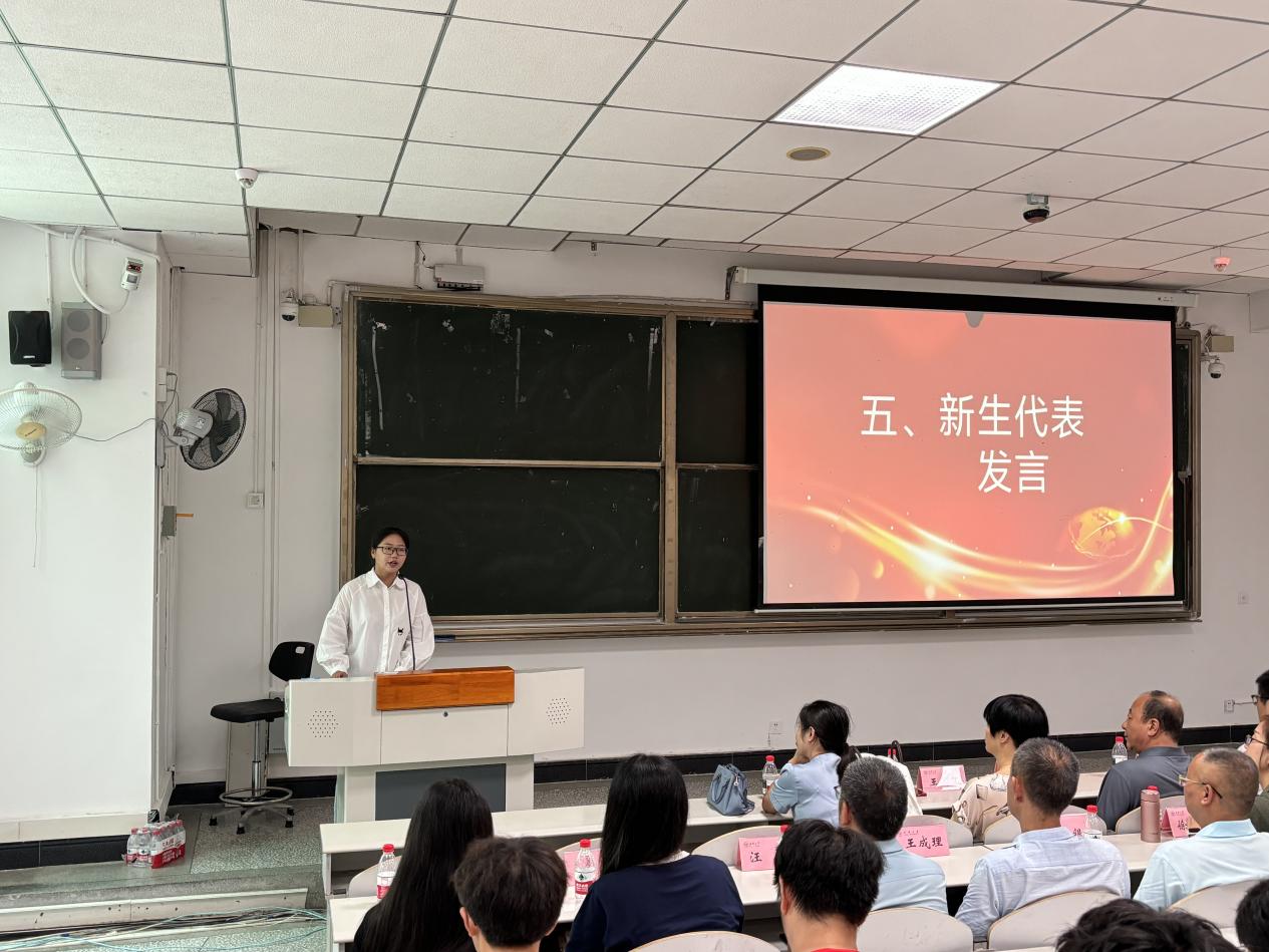 在师生代表发言环节,数学系刘苏定老师、物理系吉驭嫔老师、化学系王继宇老师作为教师代表依次发言。他们结合各自学科特点何求学经历,寄语新生要培养严谨的科学态度,保持好奇心和探索精神,在追求真理的道路上坚持不懈。随后,理学院团委学生会主席团成员李益林作为高年级学生代表,分享了在理学院学习成长的体会。他建议新生要合理规划时间,积极参与科研实践和学生活动,全面提升综合素质。2025级化学专业王玲铃同学代表全体新生发言,表达了对大学生活的美好憧憬和立志成才的坚定决心。