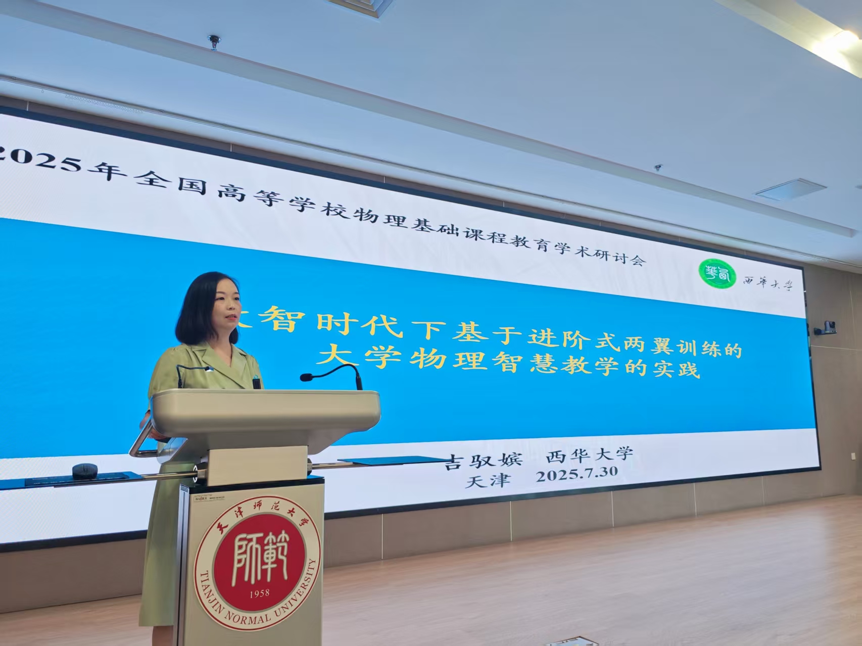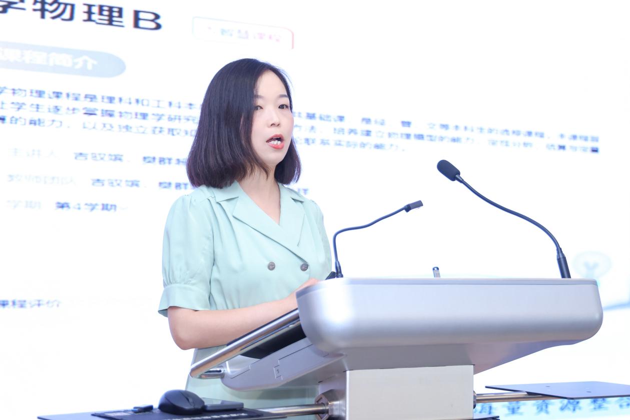 会议以大会报告、分论坛报告、张贴论文的形式进行学术研讨,我校国家级一流课程《大学物理B》负责人吉驭嫔受邀在分论坛作题为《数智时代下基于进阶式两翼训练的大学物理教学模式的实践》的专题报告。吉驭嫔先介绍了我校国家级一流专业建设点应用物理学专业及特色做法,然后重点分享了国家级一流课程《大学物理B》的建设经验。大学物理课程以进阶式两翼训练为核心,引入线上线下混合式教学模式,基于课程知识图谱,实现个性化学习规模落地。